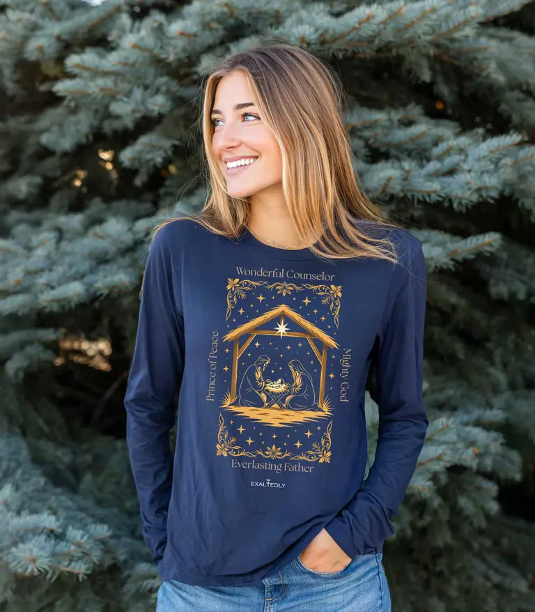 Honor the true meaning of Christmas with our Wonderful Counselor long sleeve tee. Featuring the nativity and the names of Jesus from Isaiah 9:6—Wonderful Counselor, Mighty God, Everlasting Father, Prince of Peace—this timeless design celebrates the Savior’s birth.