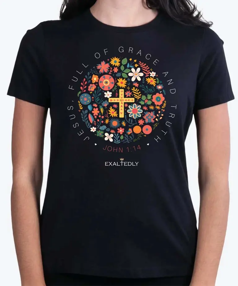 Introducing the “Jesus Full of Grace and Truth” Tee, a fashion-forward expression of faith for the modern Christian woman. This striking black t-shirt showcases a vivid, colorful pattern within a circle, symbolizing the unending grace and truth found in Jesus. The encircling words, “Jesus, Full of Grace and Truth – John 1:14,” remind us of the powerful scripture: “And the Word became flesh and dwelt among us, and we have seen his glory, glory as of the only Son from the Father, full of grace and truth” (John 1:14).
